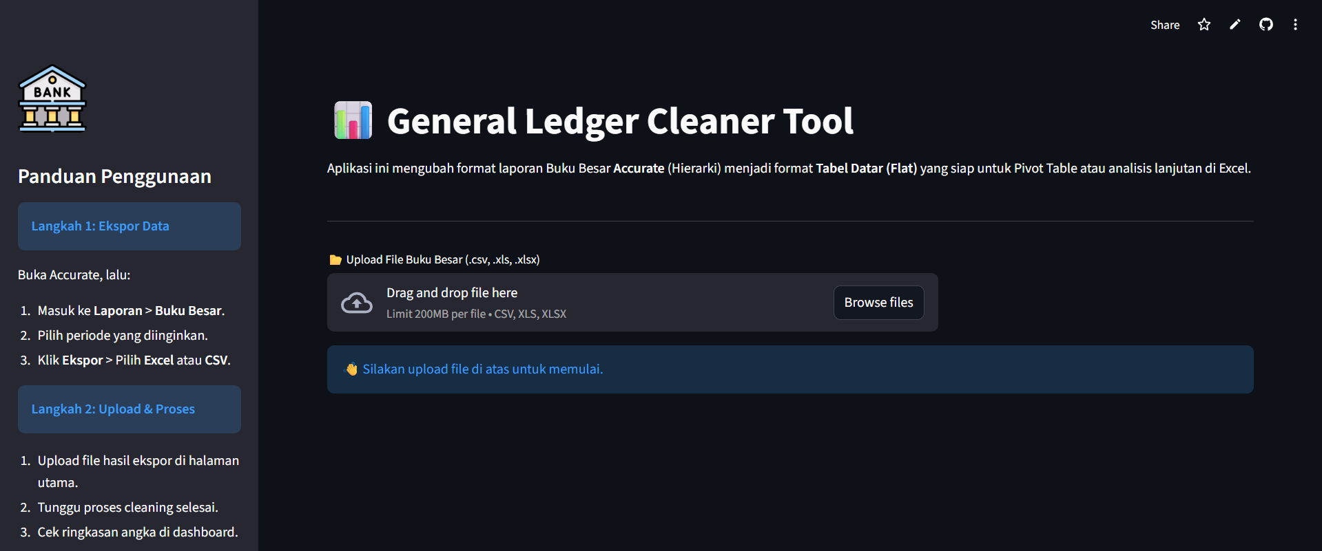 Sistem berbasis web untuk membersihkan dan memvalidasi data buku besar dari software akuntansi Accurate dan MYOB.
